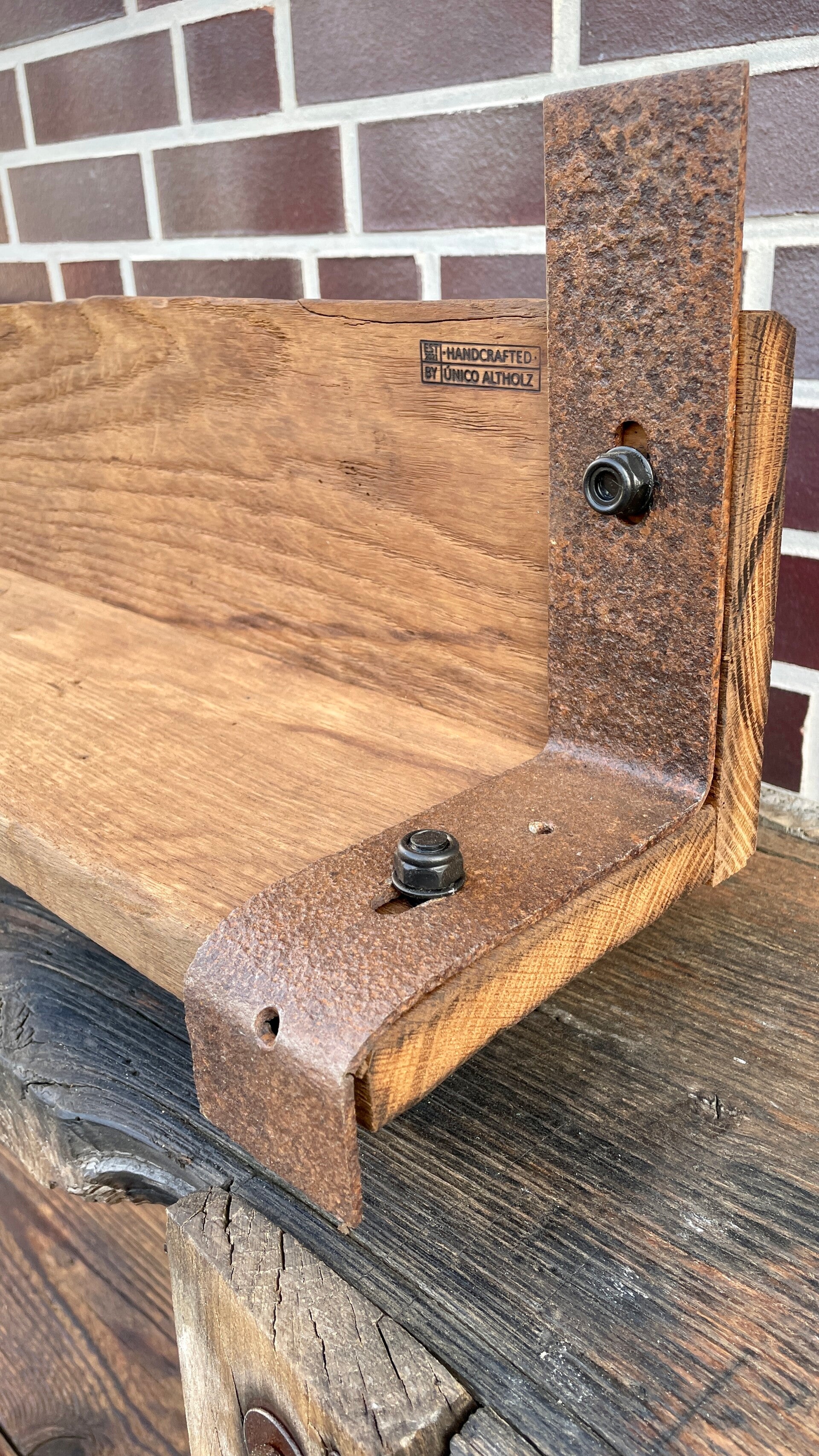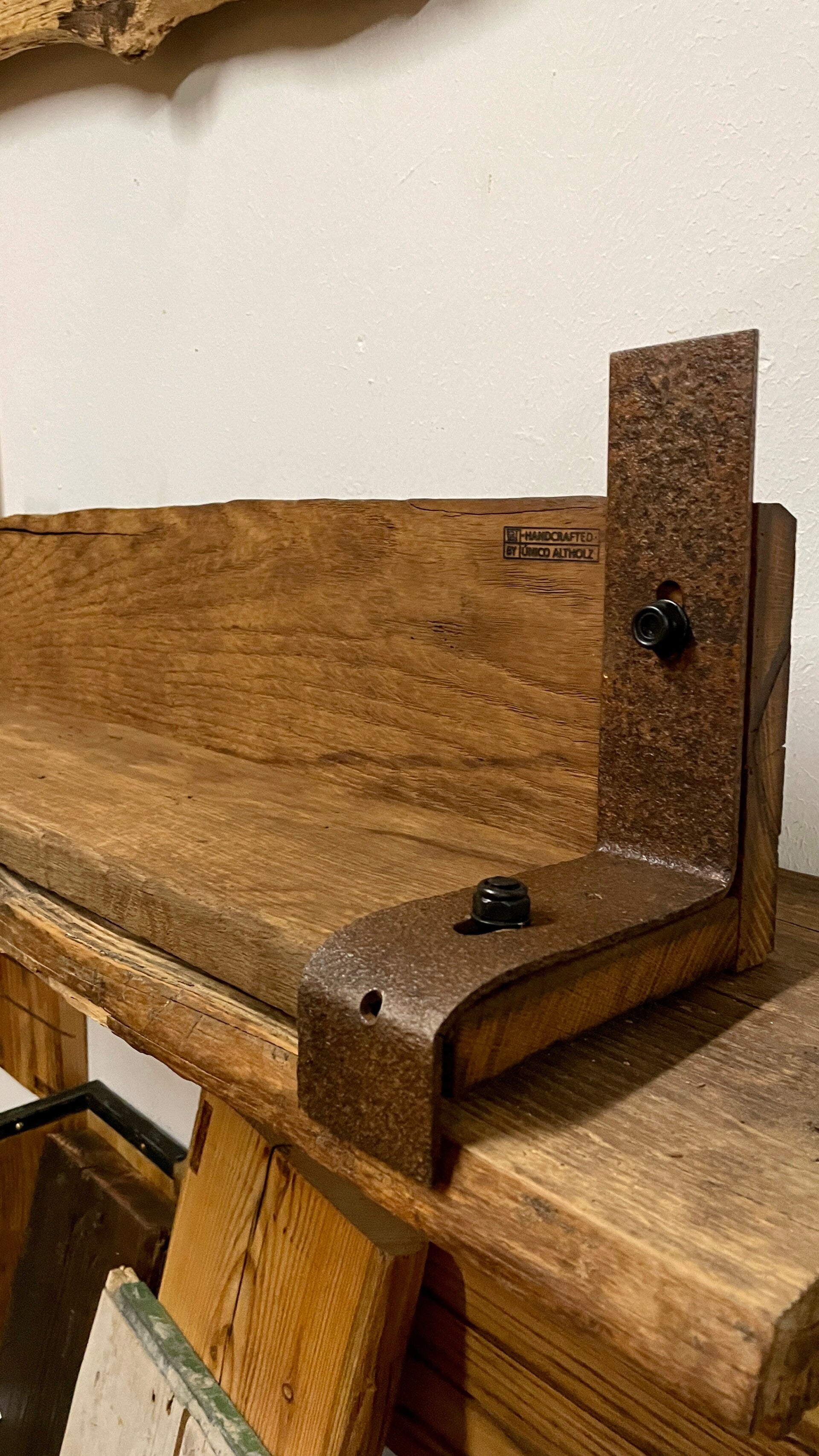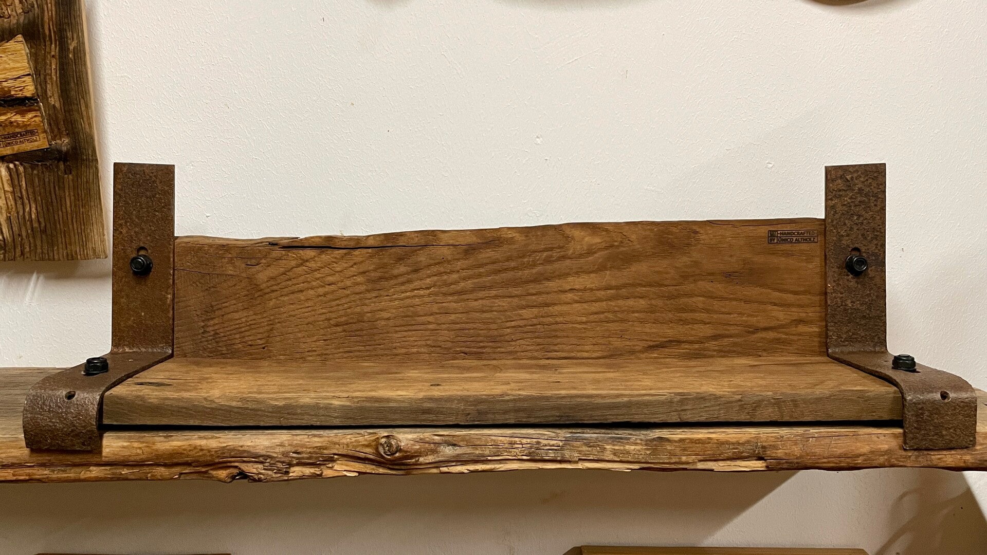 Das Regalbrett wurde aus altem Eichenholz gefertigt.