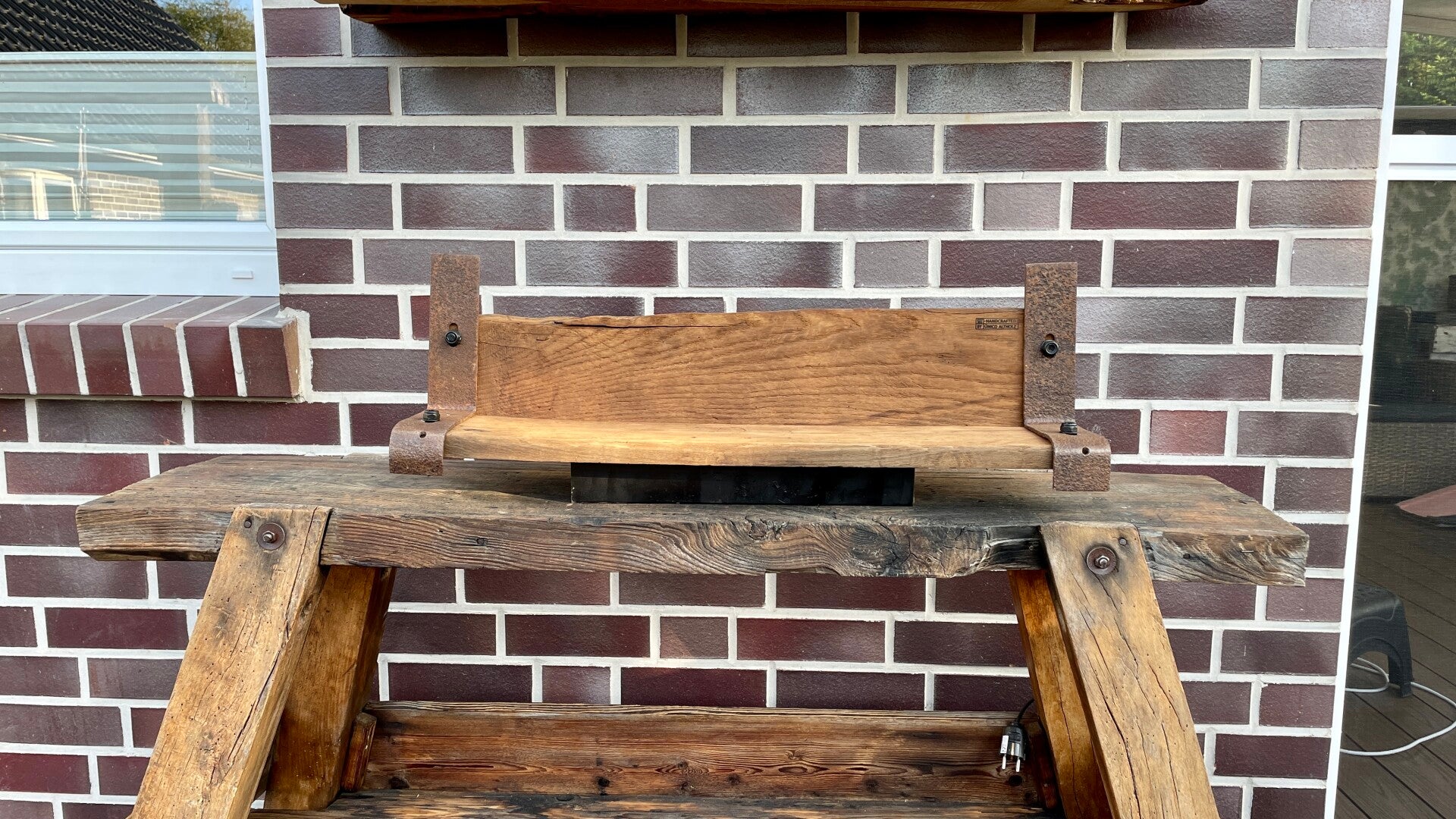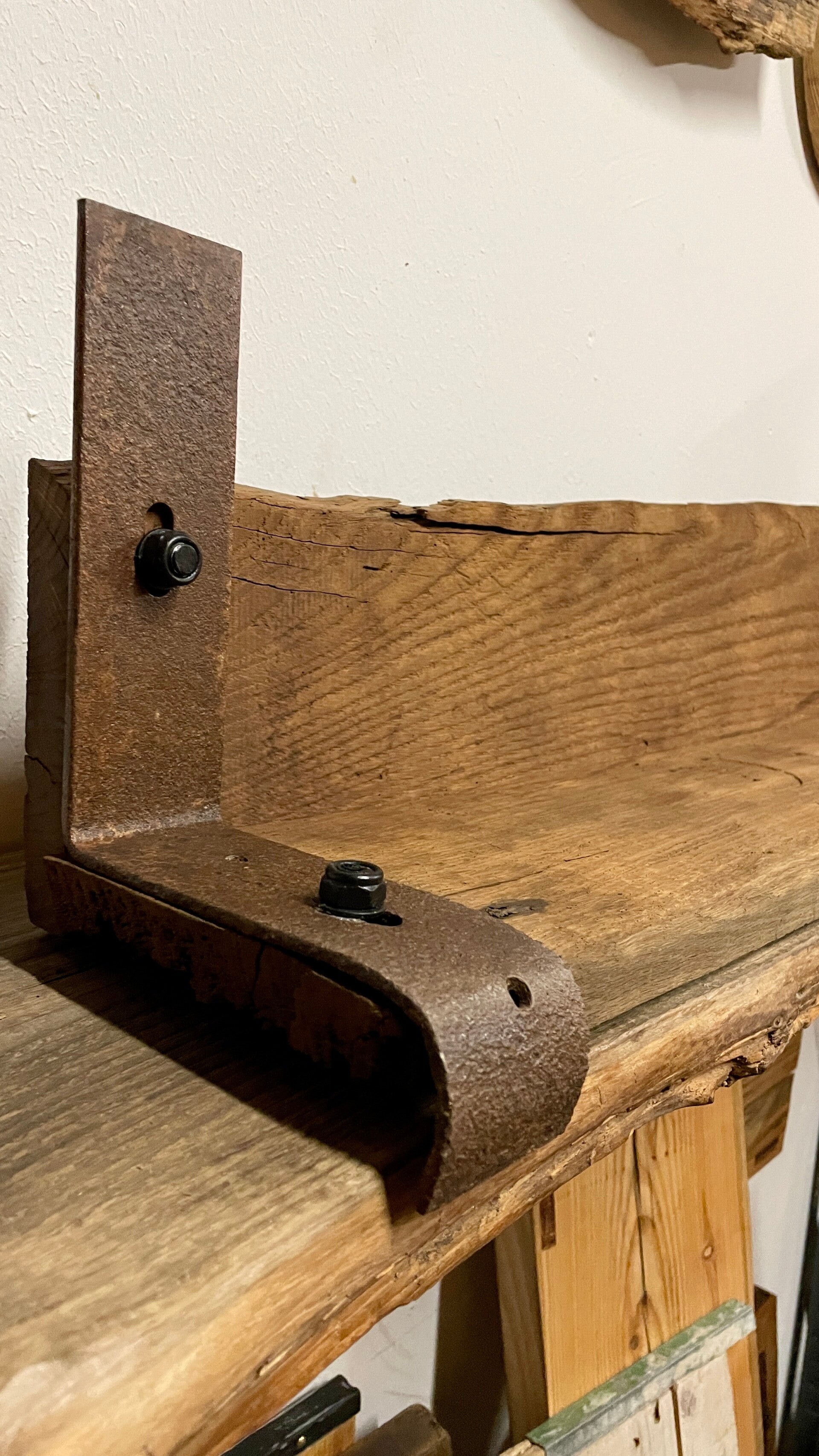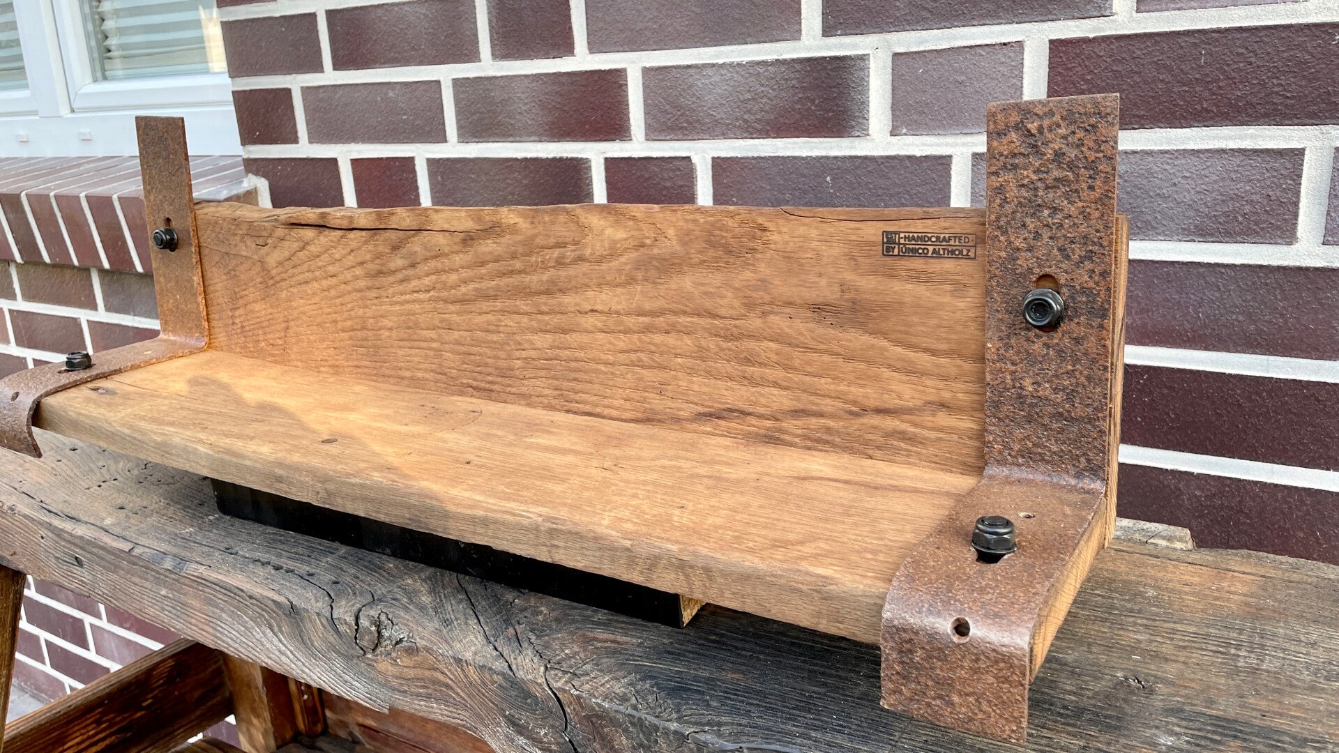 Das Regalbrett wurde aus altem Eichenholz gefertigt.