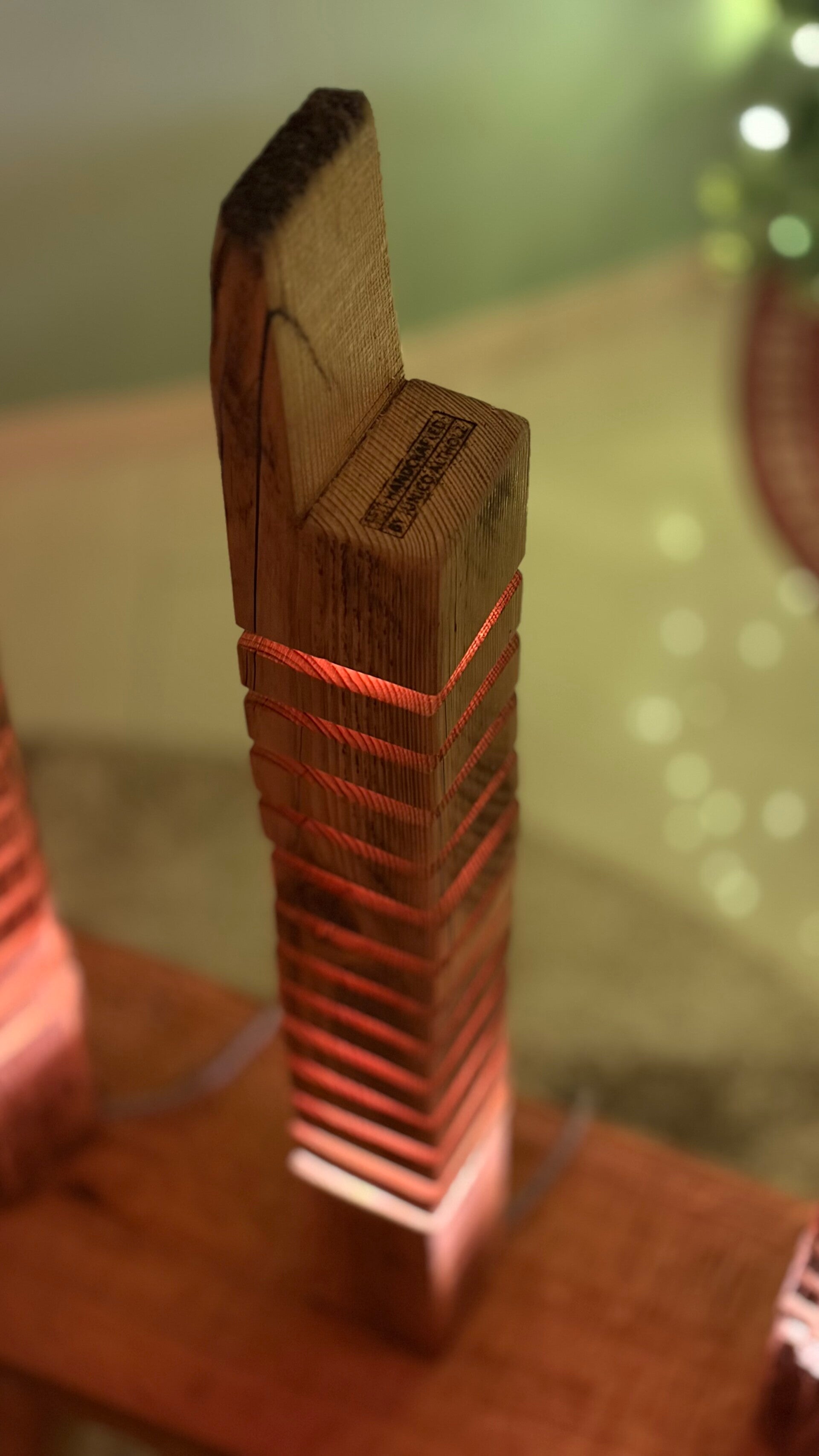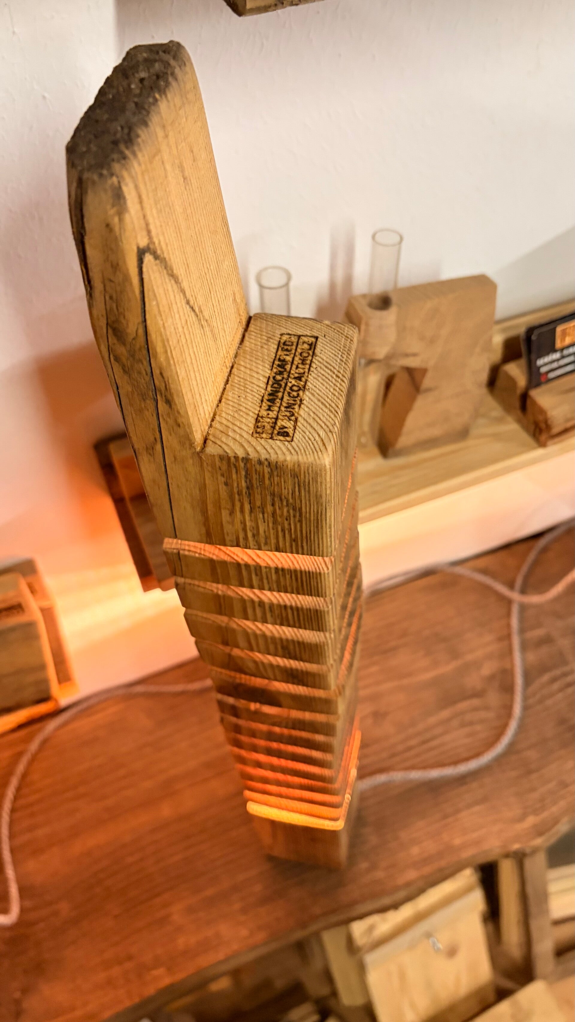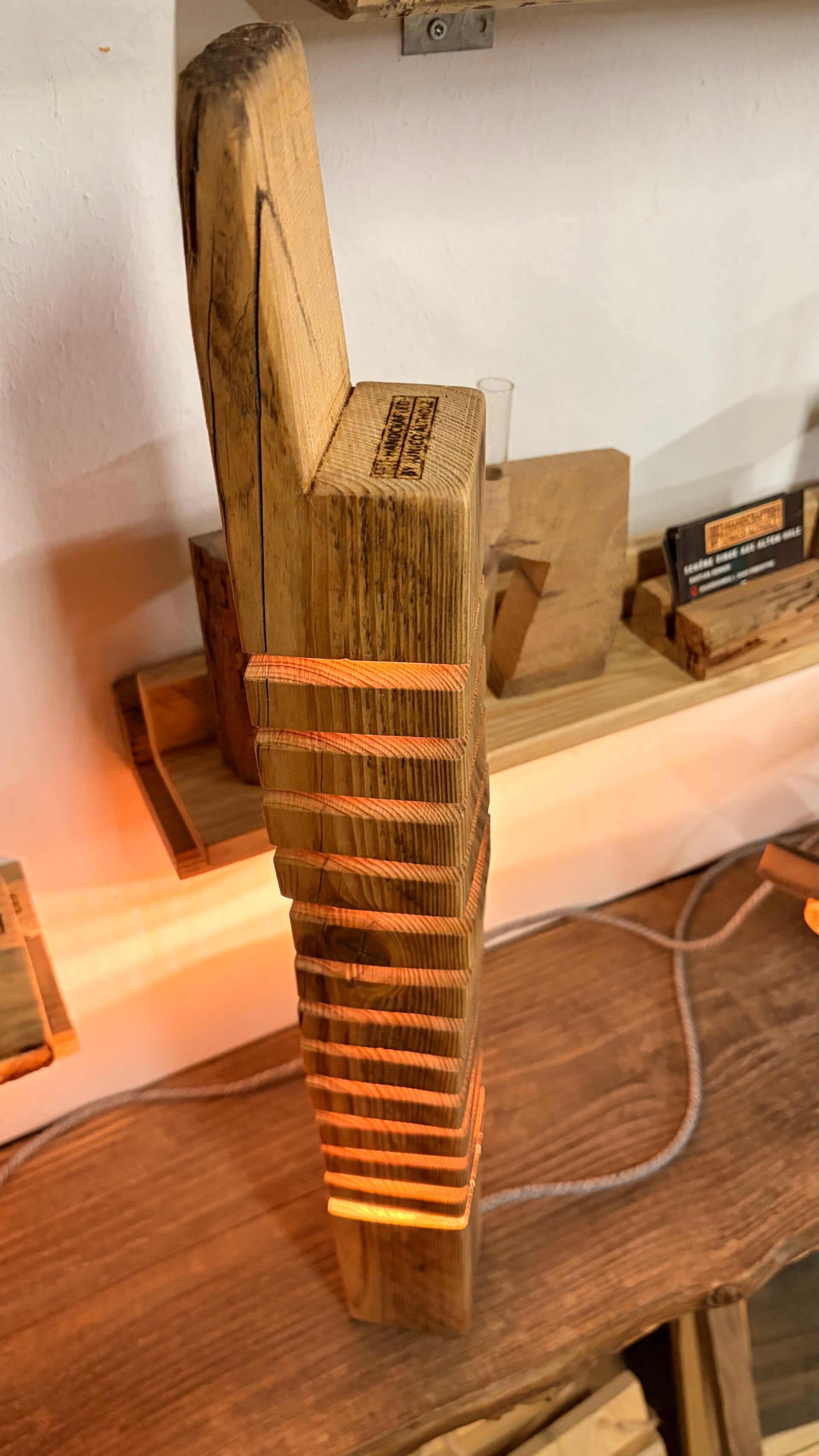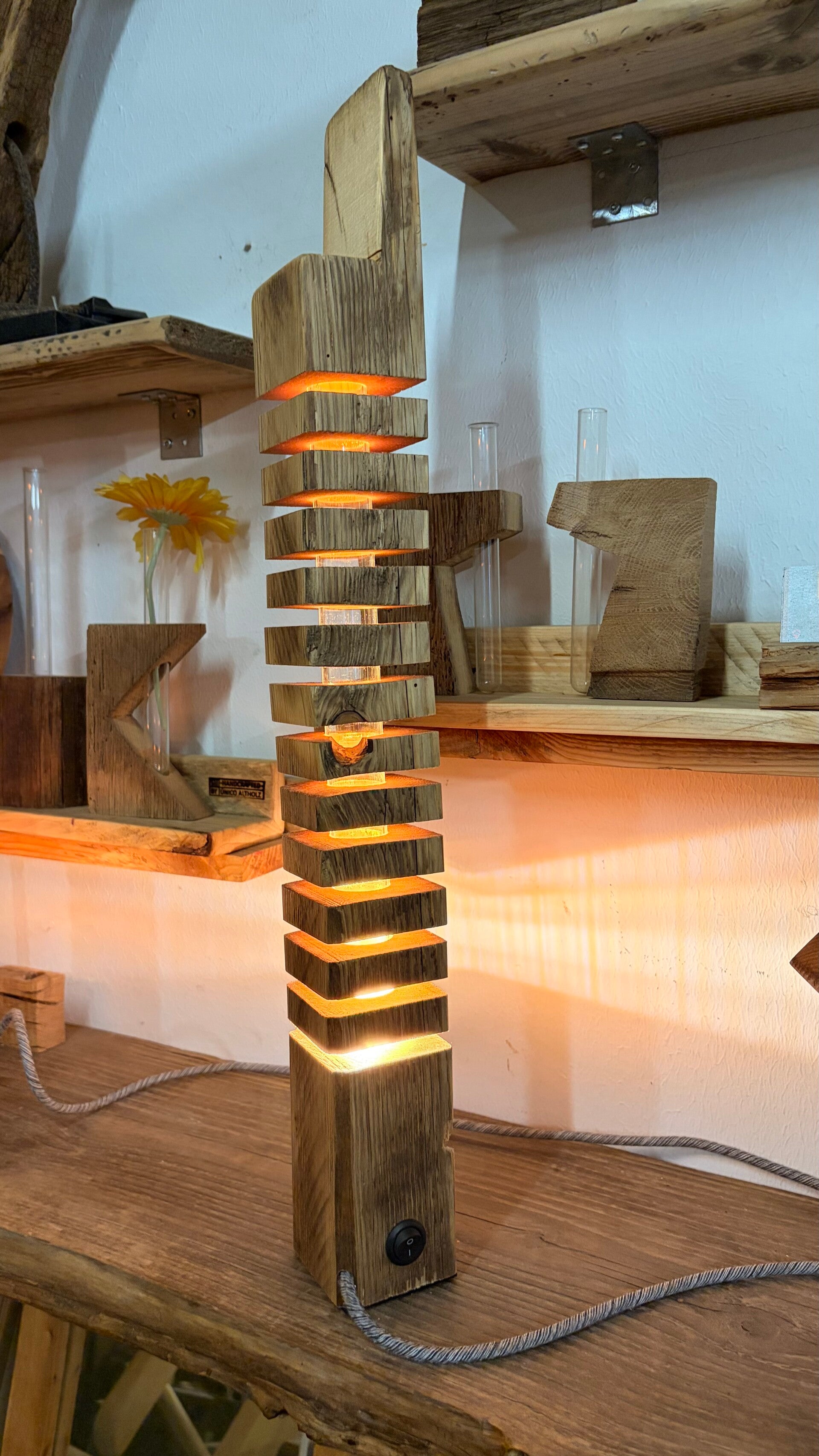 Die Altholzlampe wurde in Handarbeit aus einem alten Holzbalken hergestellt. Die Holzscheiben scheinen zu schweben.