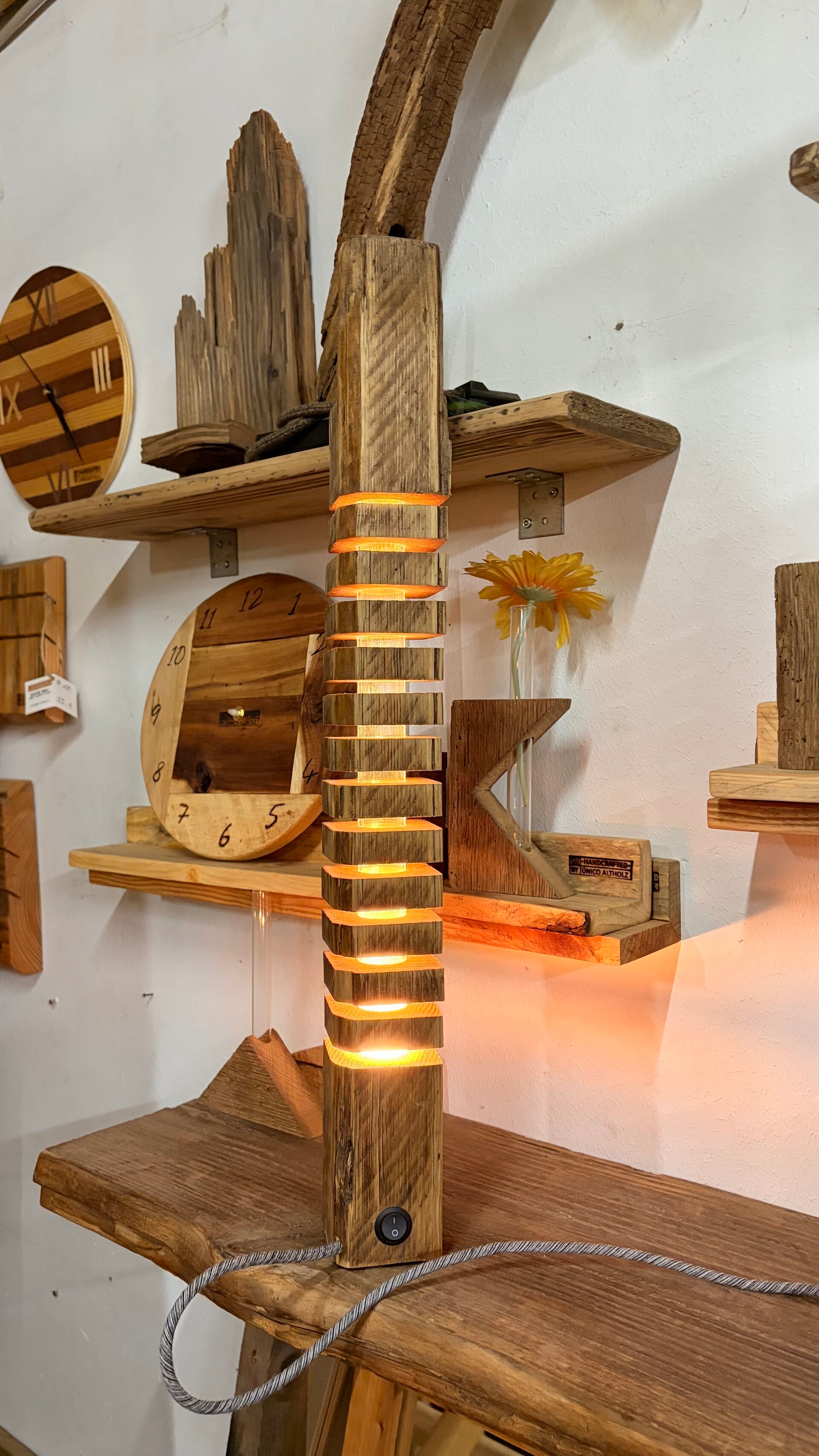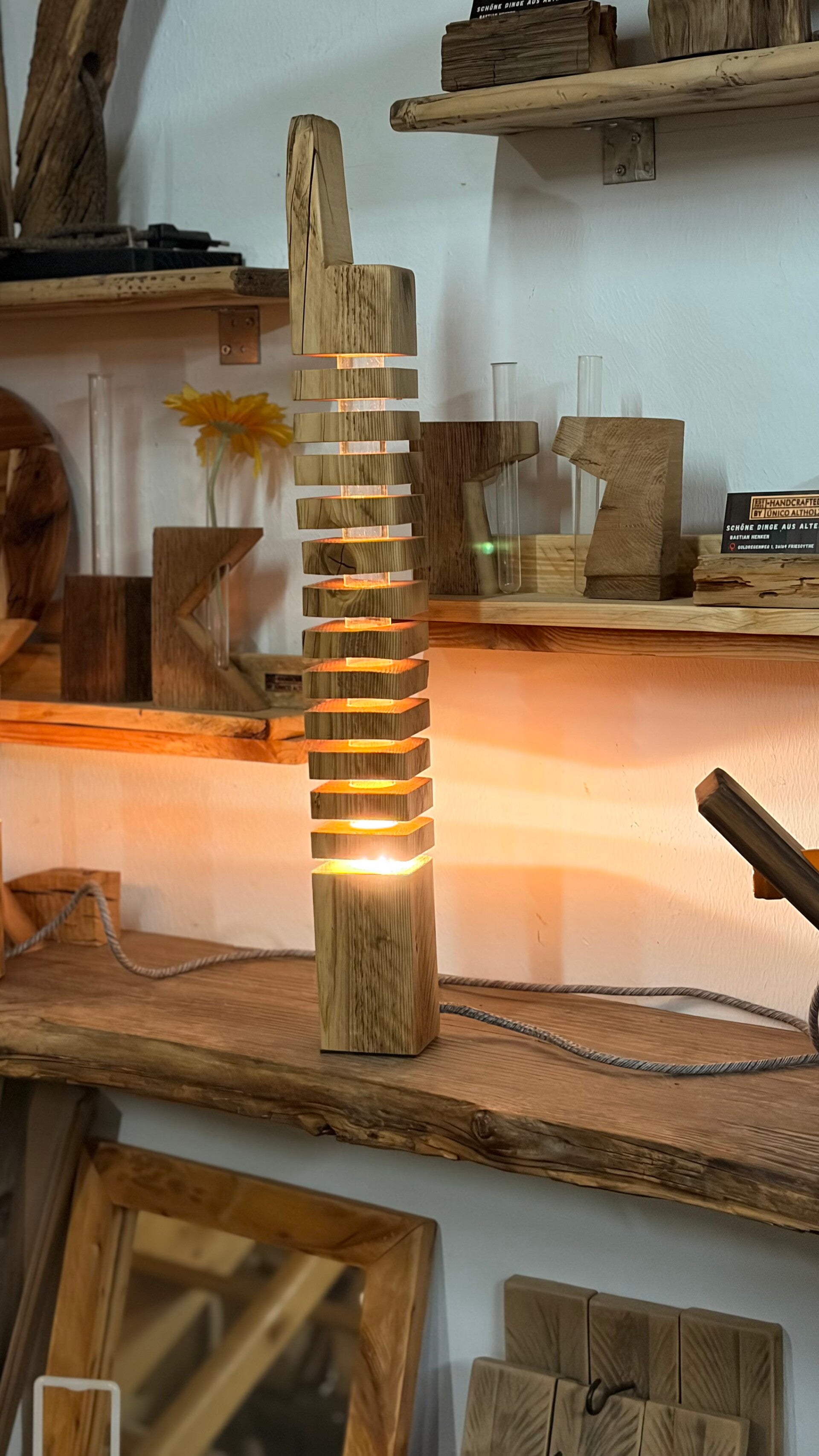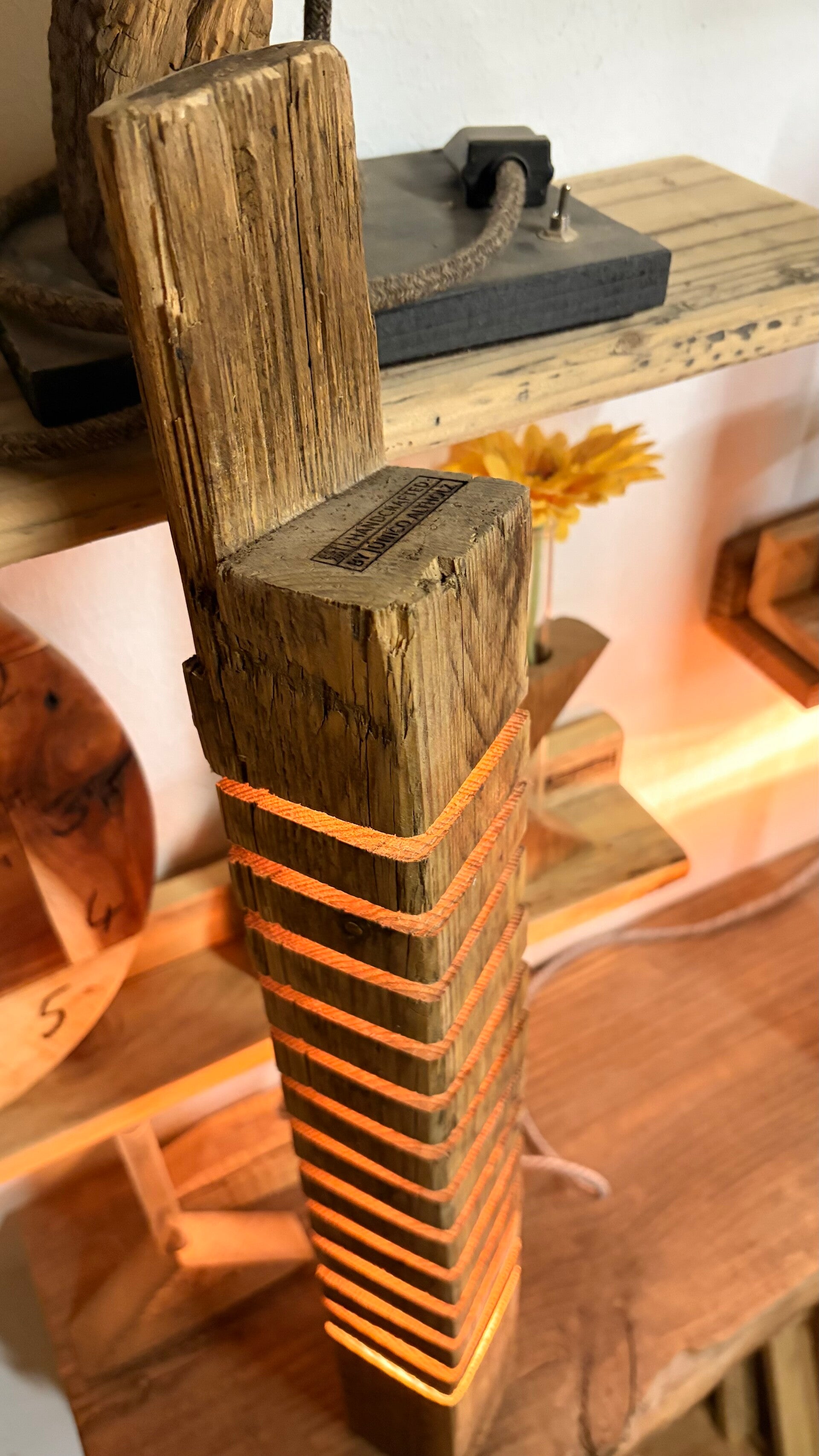 Die Altholzlampe wurde in Handarbeit aus einem alten Holzbalken hergestellt. Die Holzscheiben scheinen zu schweben.