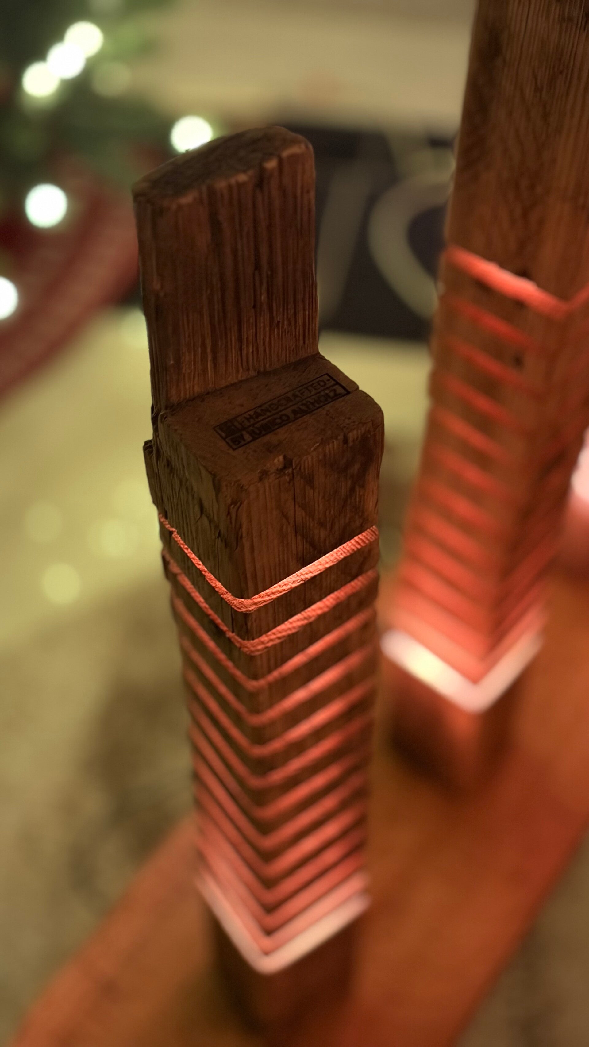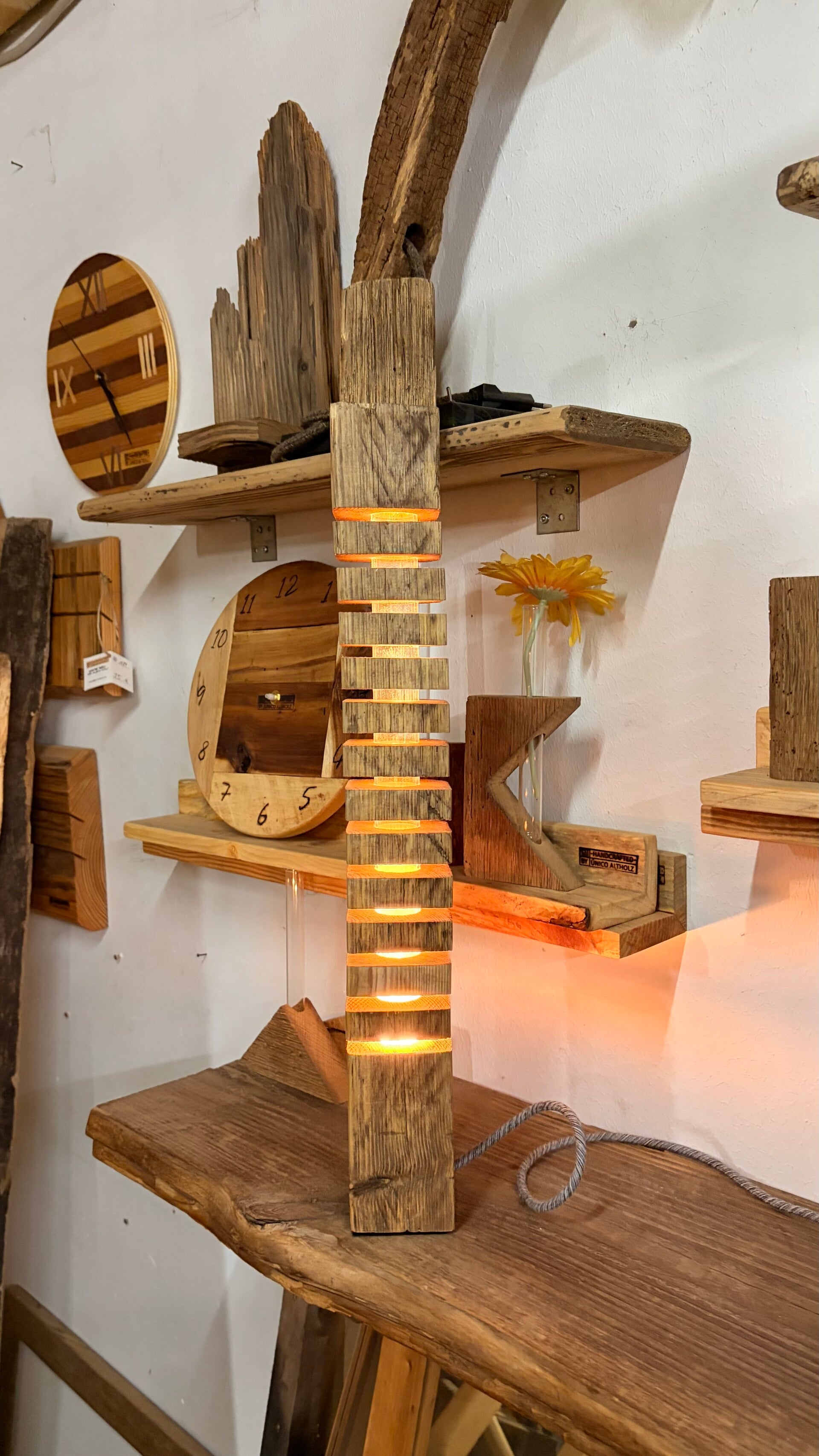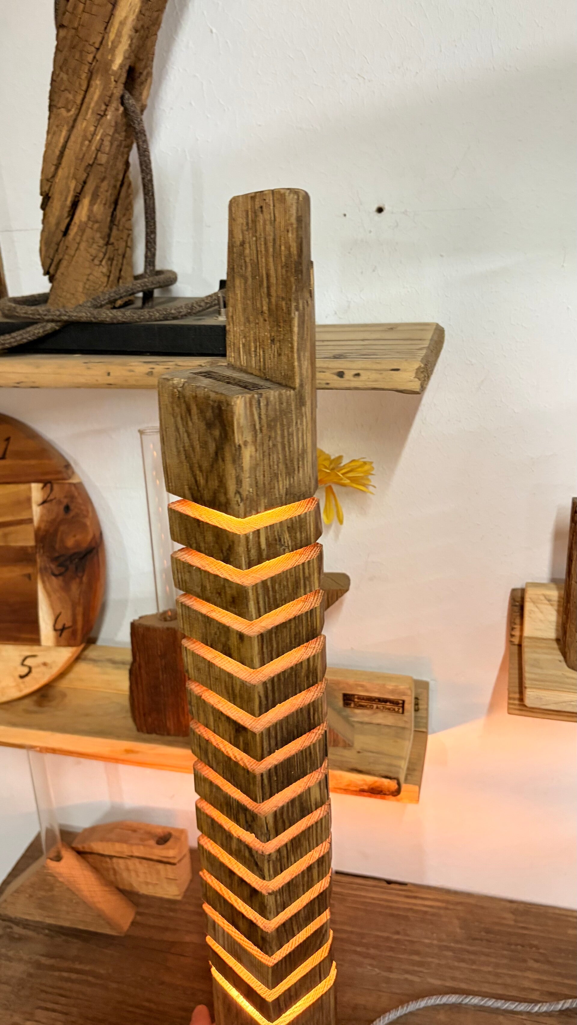 Die Altholzlampe wurde in Handarbeit aus einem alten Holzbalken hergestellt. Die Holzscheiben scheinen zu schweben.