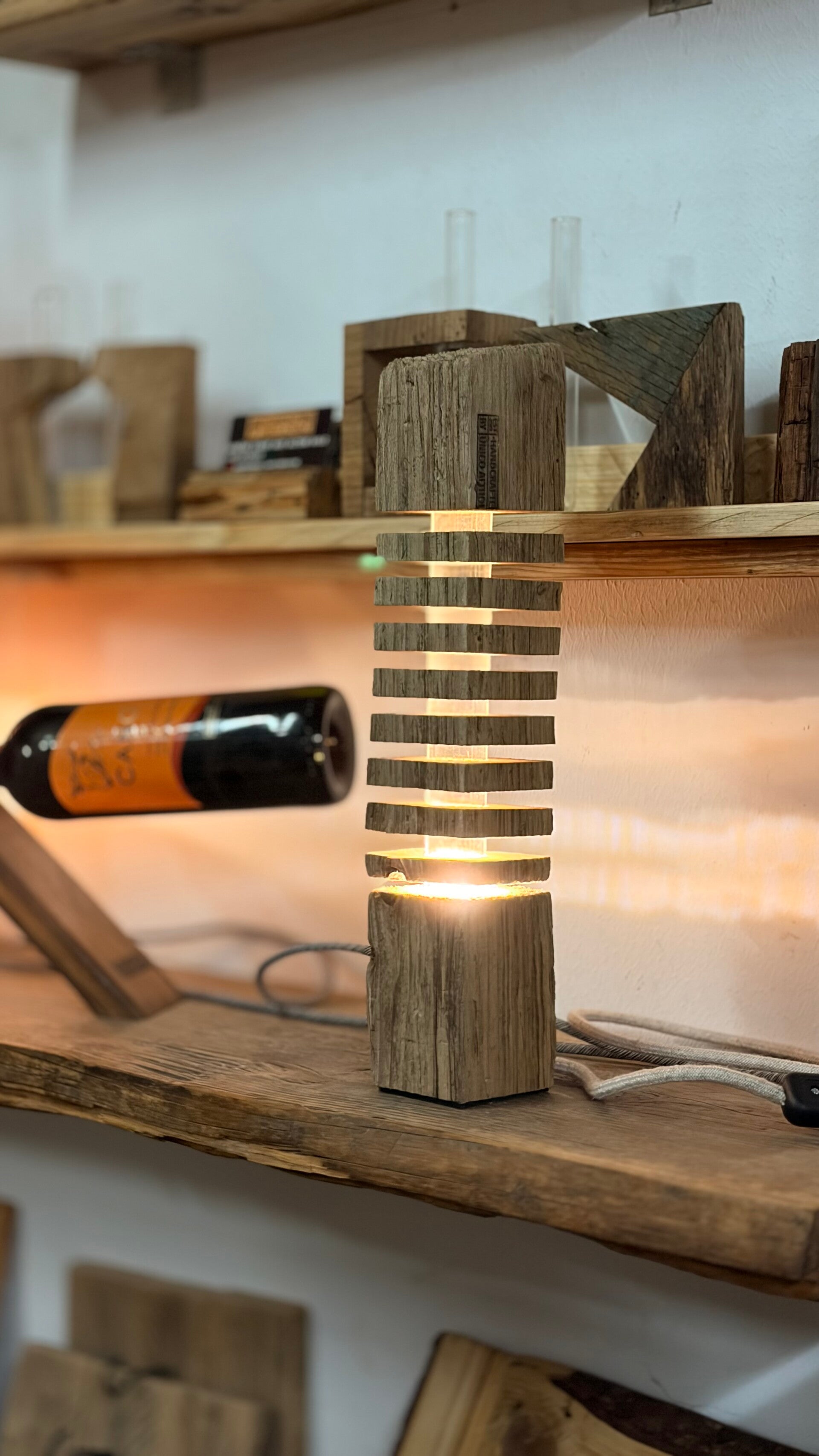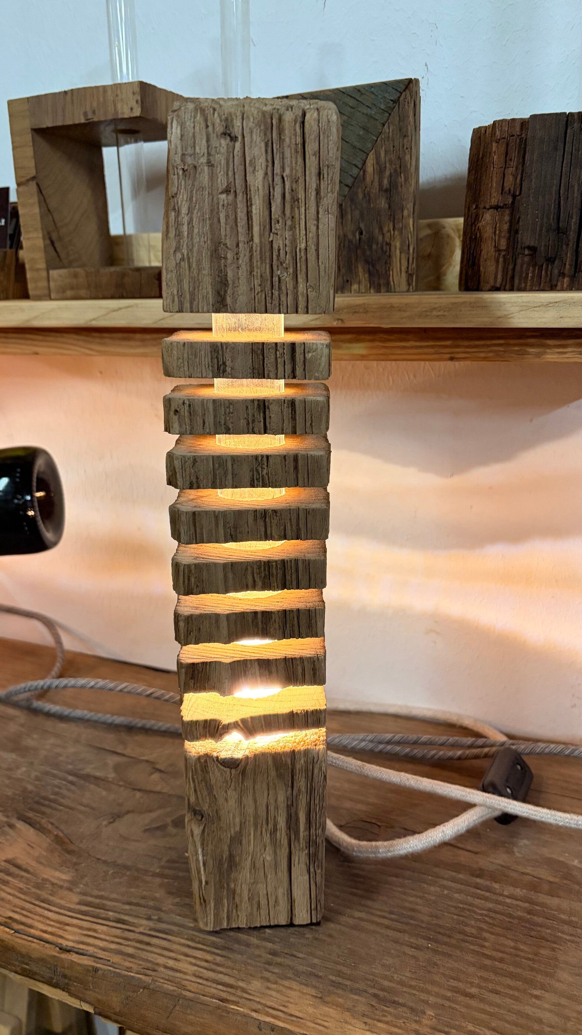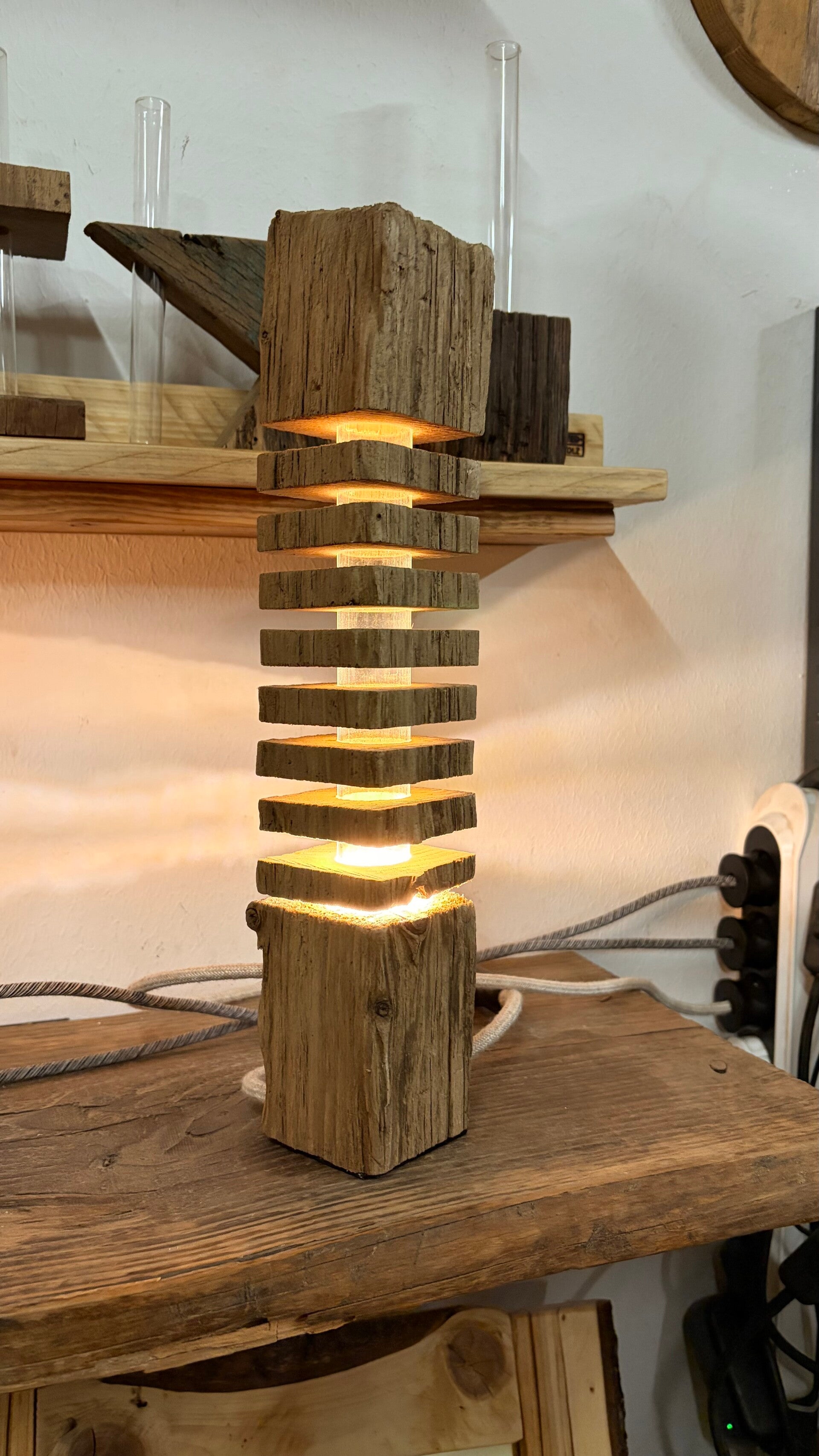 Holzlampe aus Altholz – handgefertigte Tischlampe mit LED