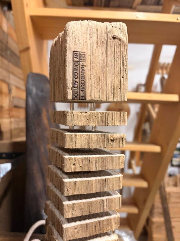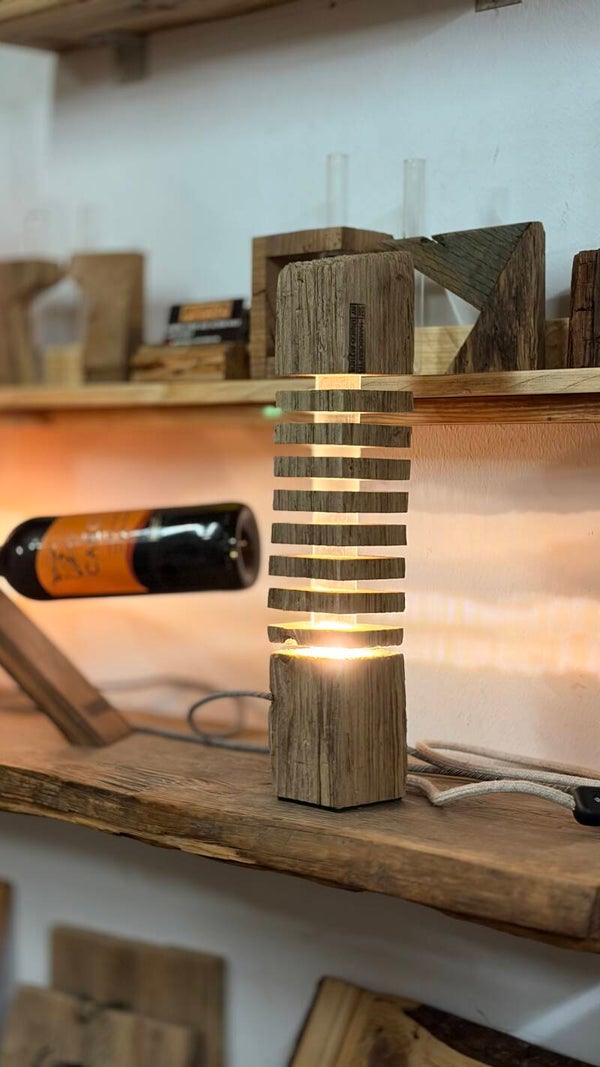 Diese handgefertigte Tischlampe aus massivem Altholz verbindet rustikalen Charme mit modernem Lichtdesign. Durch die eingeschnittenen Lamellen entsteht ein besonderes Lichtspiel, das eine warme und gemütliche Atmosphäre schafft.